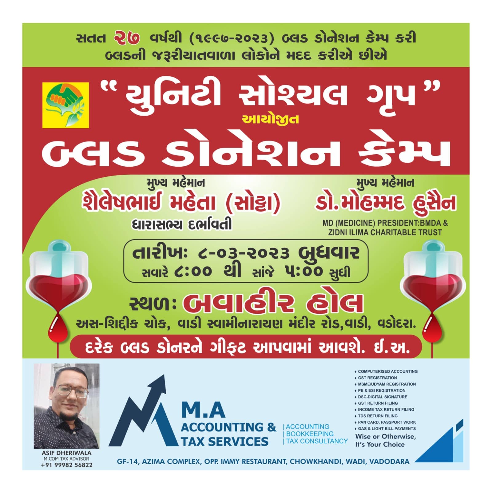 યુનિટી સોશ્યલ ગ્રુપ દ્વારા 08-03-2023 ના રોજ રક્તદાન શિબિરનું આયોજન કરવામાં આવ્યું છે.